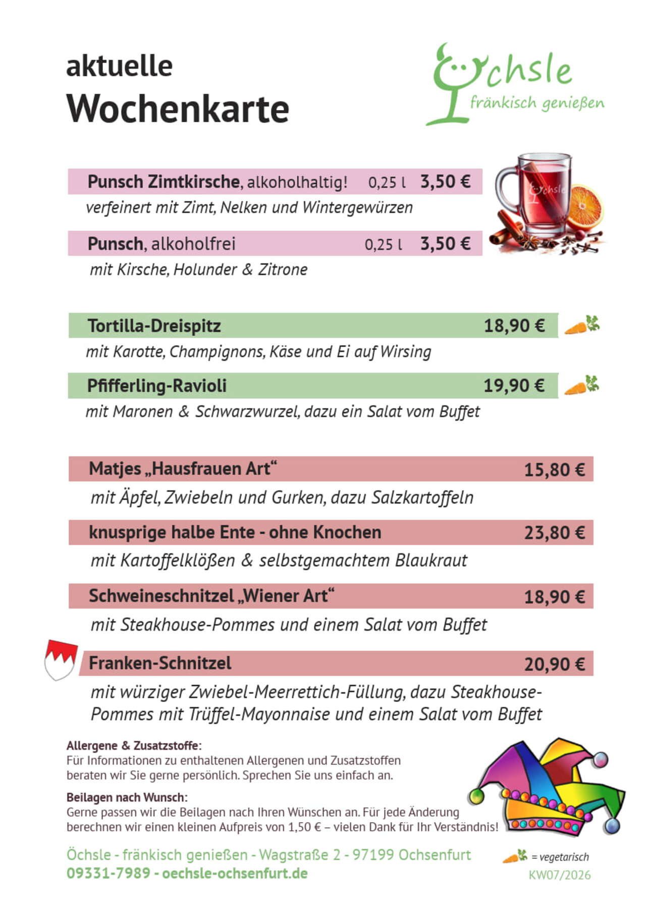 Lust auf etwas Neues? Unsere wechselnde Wochenkarte überrascht Sie regelmäßig mit saisonalen Highlights. Schauen Sie vorbei auf unserer Webseite: www.oechsle-ochsenfurt.de.