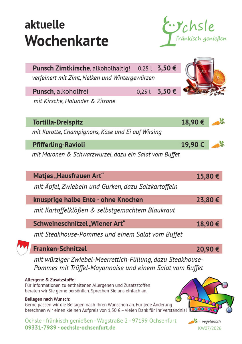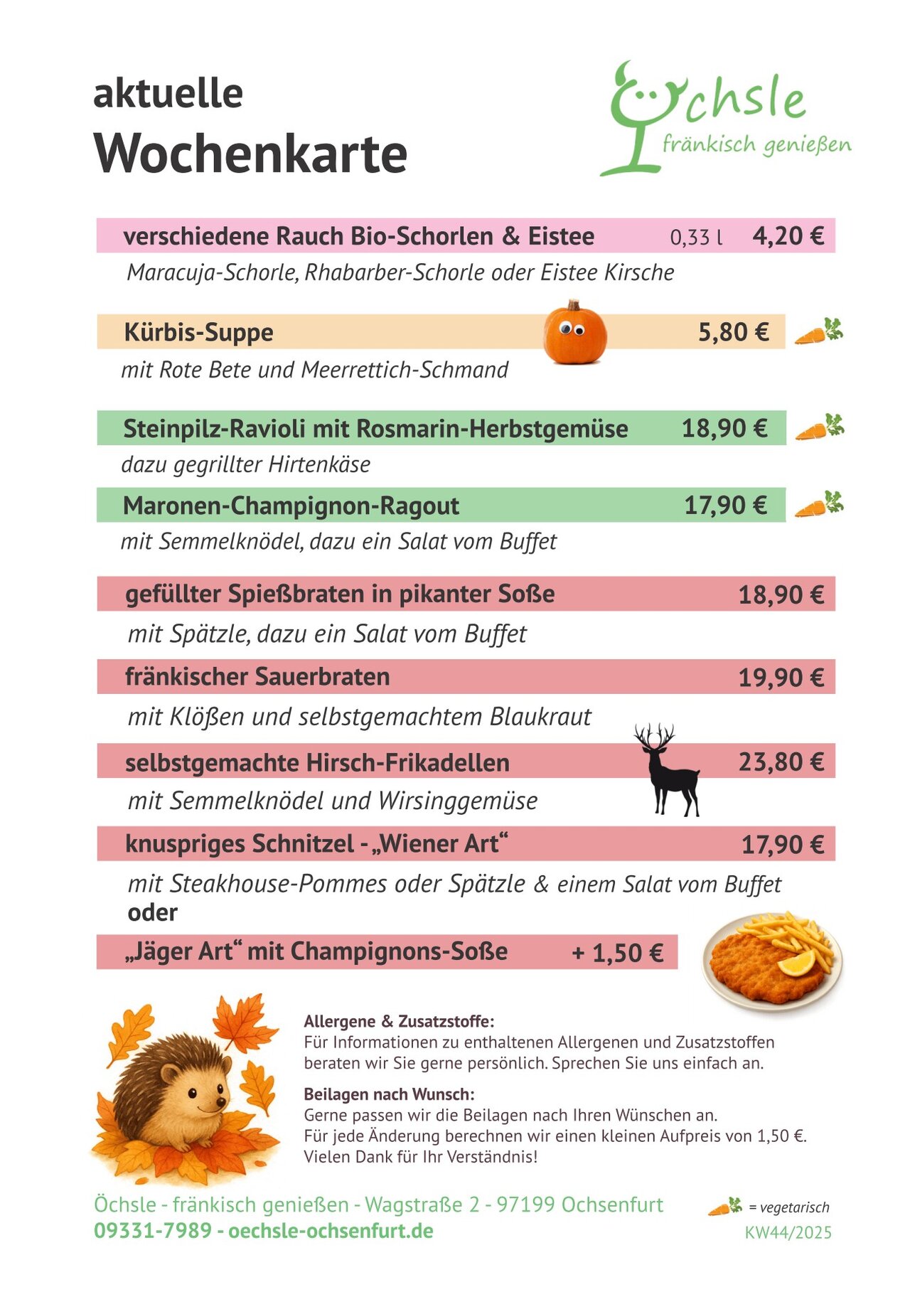 Lust auf etwas Neues? Unsere wechselnde Wochenkarte überrascht Sie regelmäßig mit saisonalen Highlights. Schauen Sie vorbei auf unserer Webseite: www.oechsle-ochsenfurt.de.