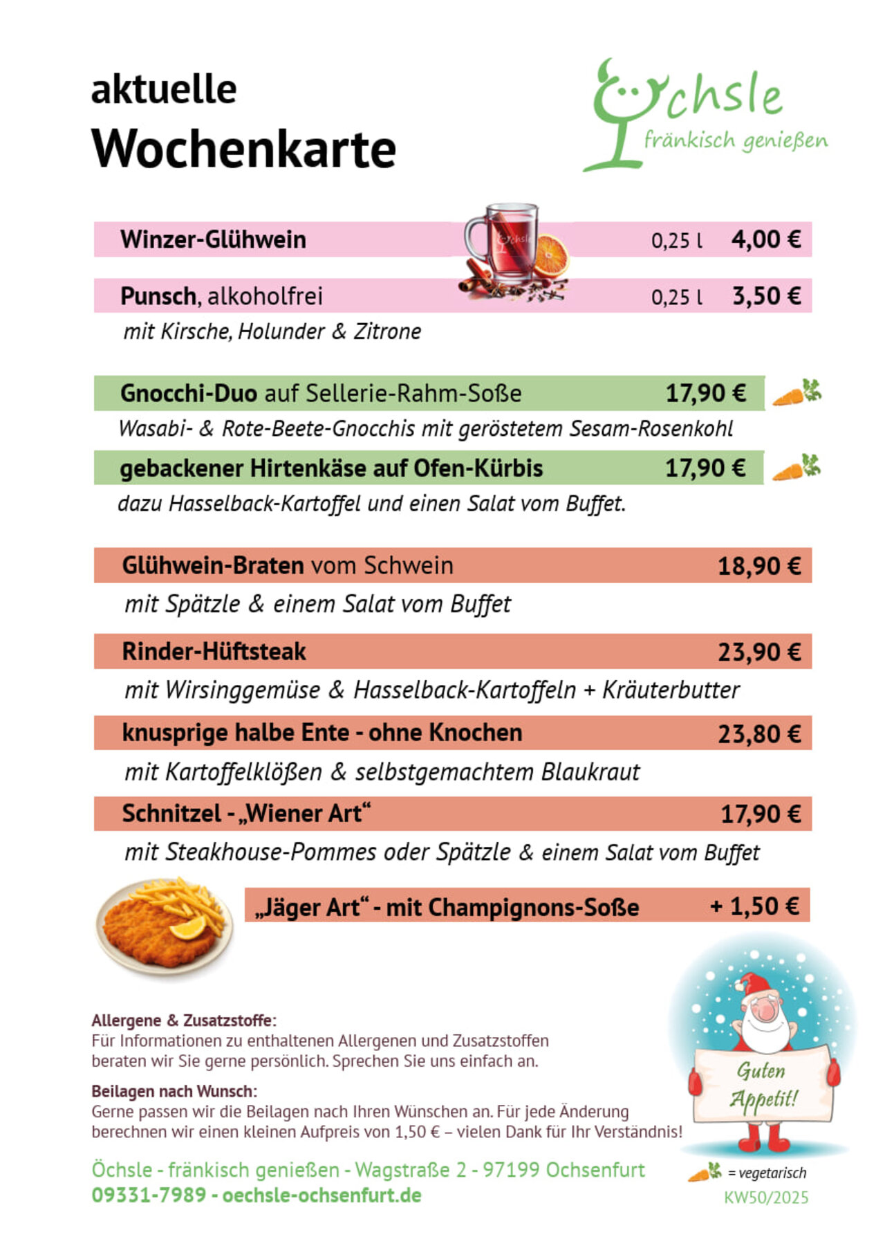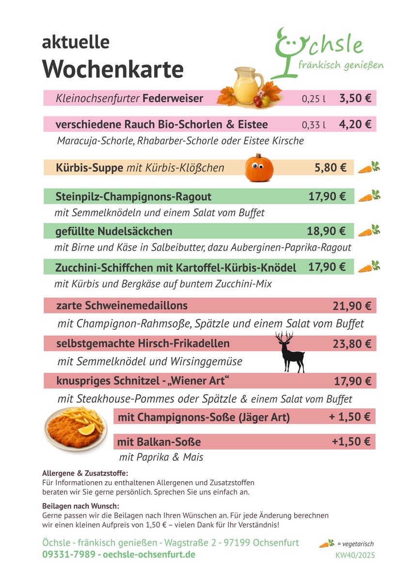 Lust auf etwas Neues? Unsere wechselnde Wochenkarte überrascht Sie regelmäßig mit saisonalen Highlights. Schauen Sie vorbei auf unserer Webseite: www.oechsle-ochsenfurt.de.