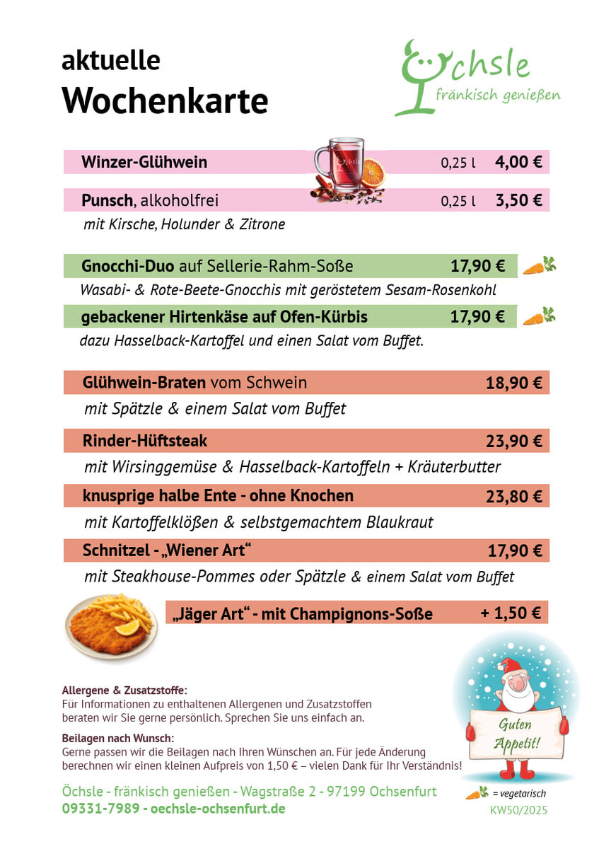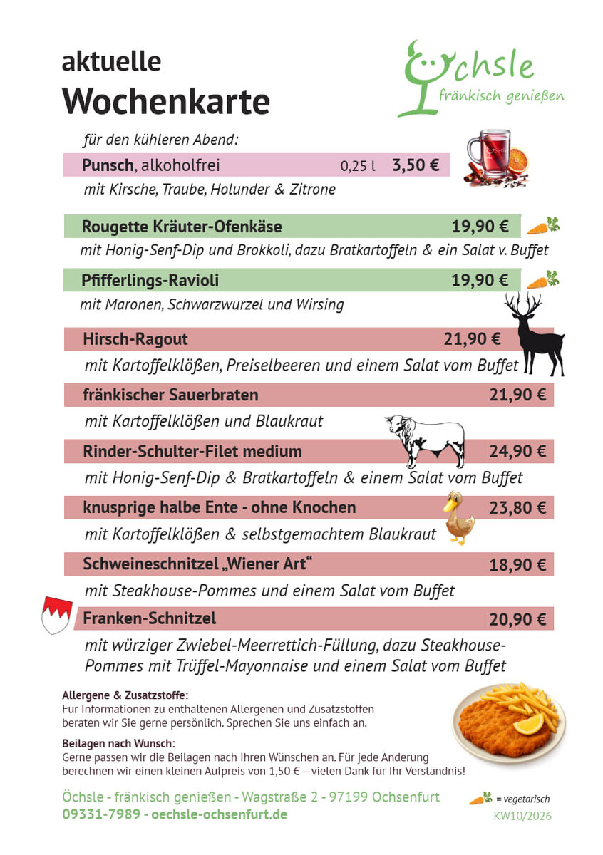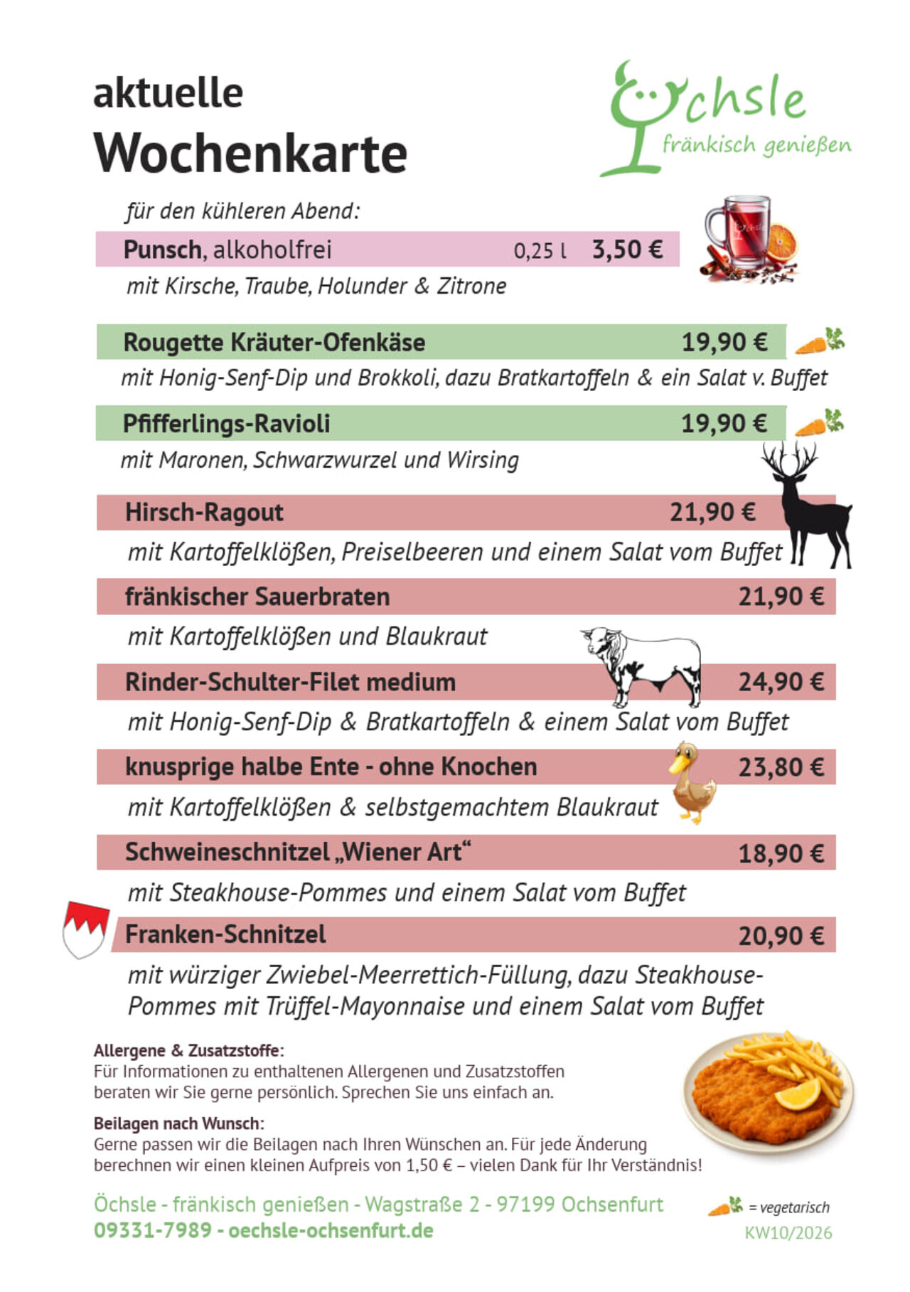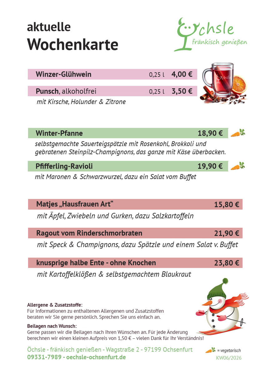 Lust auf etwas Neues? Unsere wechselnde Wochenkarte überrascht Sie regelmäßig mit saisonalen Highlights. Schauen Sie vorbei auf unserer Webseite: www.oechsle-ochsenfurt.de.