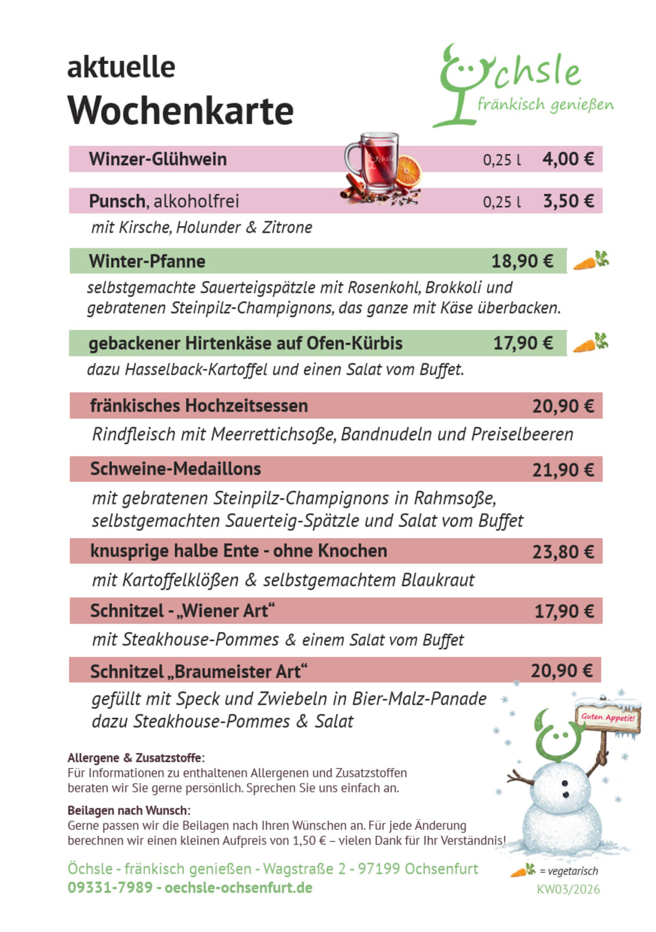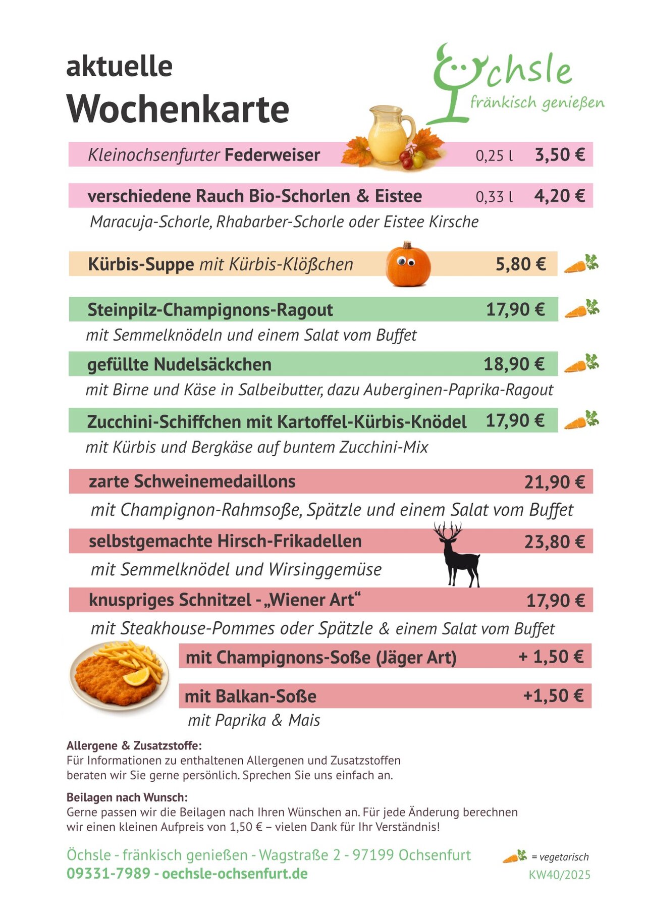Lust auf etwas Neues? Unsere wechselnde Wochenkarte überrascht Sie regelmäßig mit saisonalen Highlights. Schauen Sie vorbei auf unserer Webseite: www.oechsle-ochsenfurt.de.